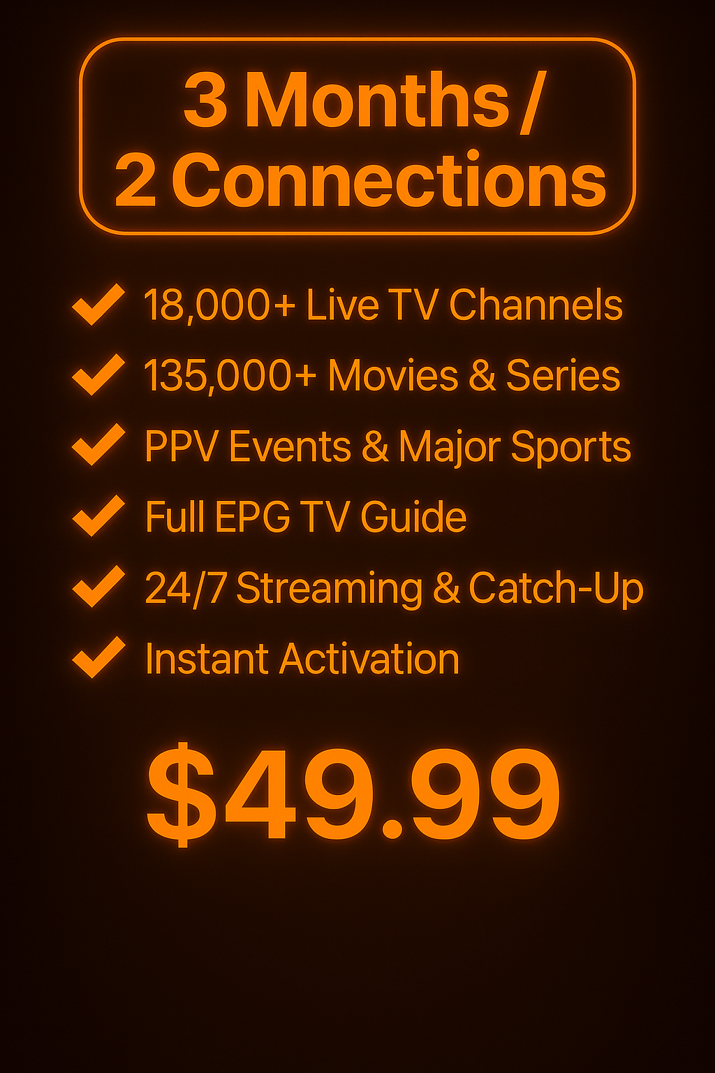 Get premium Mediasync Global service for 2 devices with our 3 Month / 2 Connections plan. Stream over 18,000 live TV channels and 135,000+ movies & series, including major sports, PPV, and adult content. Enjoy full EPG support, 24/7 channels, catch-up, and HD/4K streaming — all with instant activation and no long-term commitment. Perfect for families or multiple users.